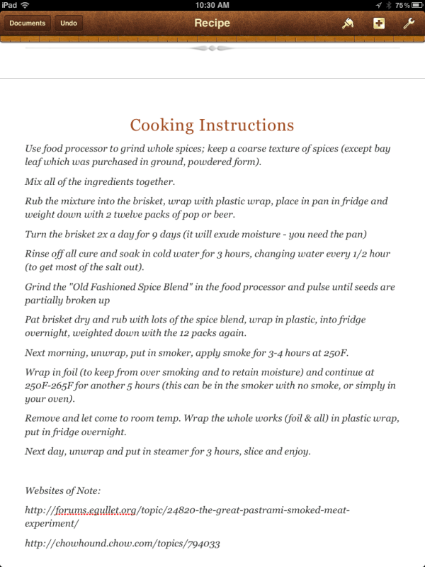 Once I had decided to jump in and make ‘Montreal Smoked Meat’, I thought I had better get it right the first time cause it ain’t cheap.  A full packer brisket runs about $55.00 and then you need Cure #1, Pepper Corns and Coriander Seeds by the pound and a few other spices.  Running the smoker is another cost at about $8.00 for pellets.  All in it will run you about $80 dollars to finish a 13 pound brisket.