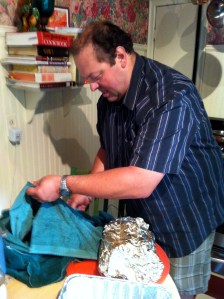 After smoking with hickory for approximately 10 hours of slow cooking and when the internal temperature reached 200 deg F I wrapped it in towels and placed it in a cooler to rest for a couple hours. Here I am taking it out of the cooler.