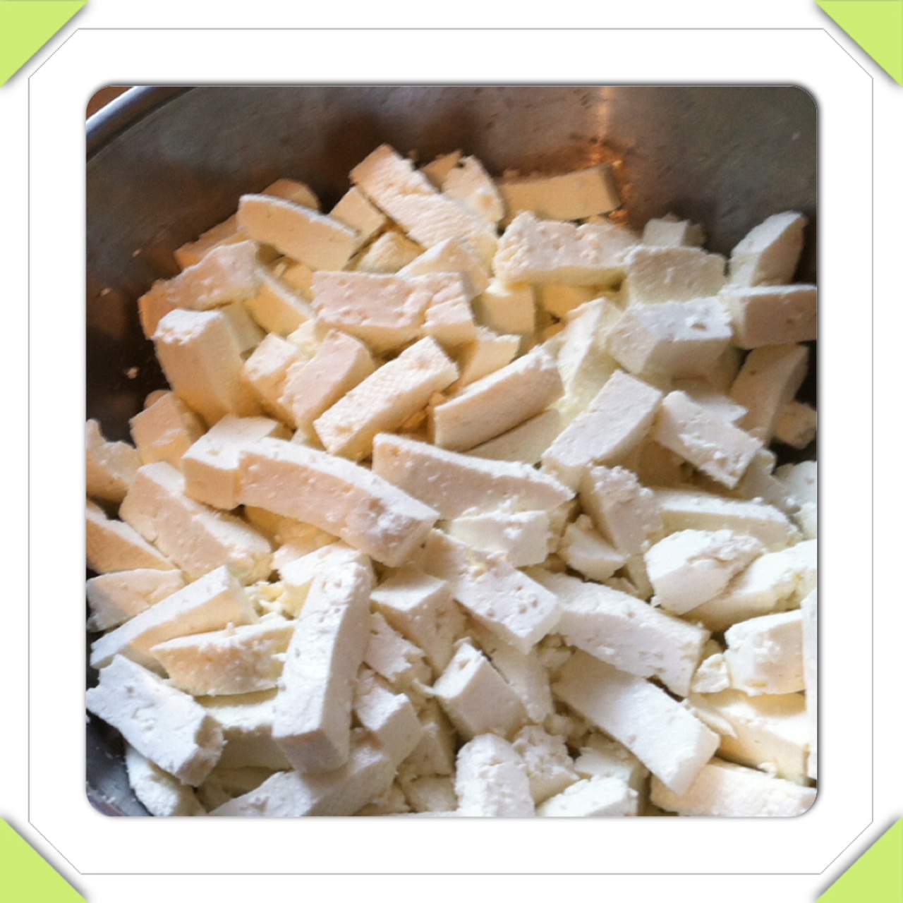 I cut them into about 1 inch cubes and tossed them with salt and lightly covered as suggested and placed them in the refrigerator to drain away additional whey. Twice a day I poured off the whey and on the fifth day I broke the curds apart as they had lightly bound (knit) together again. The goat curds were softer and creamier looking and seemed a little more delicate and had deformed in a plastic sort of way (in the geologic sense). The sheep curds had retained their cubic shape more and were firmer and somewhat crumbly.