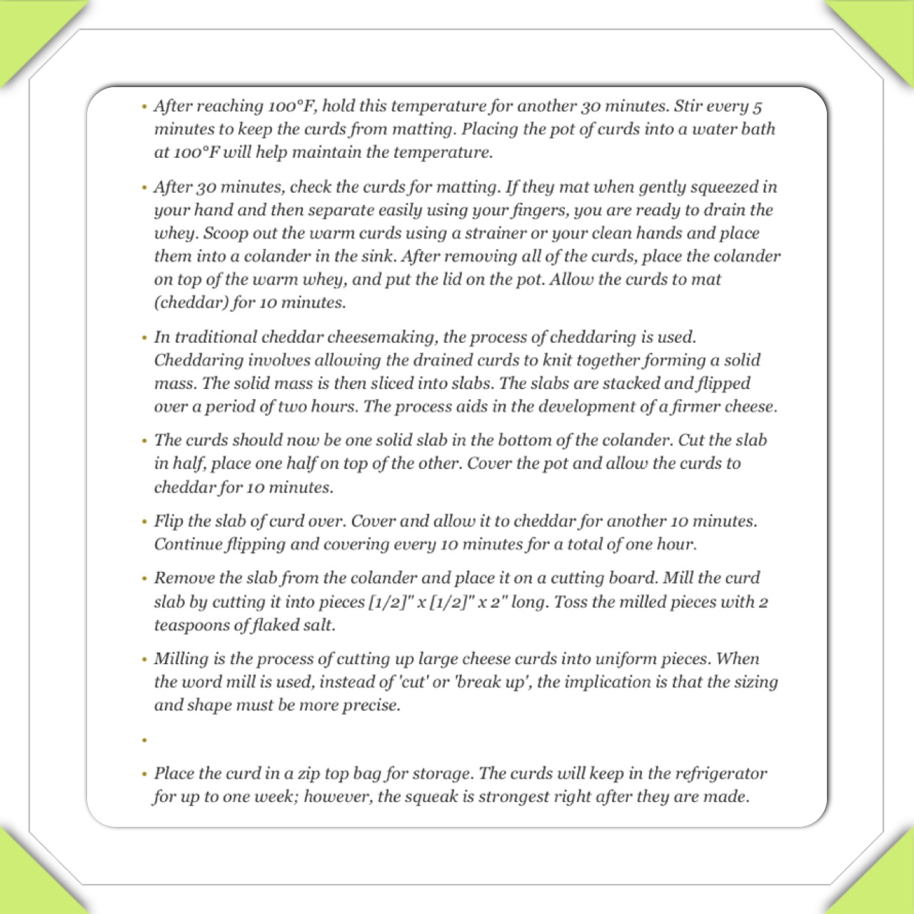 I’ve been making these cheese curds for almost a year now. I’ve tweaked the recipe slightly (only on the procedure side) and am now pretty comfortable making them. They do take a few hours to make so I would recommend that if you have a family, make at least 2 gallons of milk worth or be prepared to see them disappear pretty quickly when the primates in your family discover them on the counter.