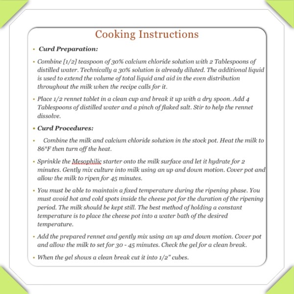As the milk volume I used was 1.75x greater than the recipe called for I decided to add slightly less than 1 teaspoon of Thermophilic B, Calcium Chloride, and Rennet. The original recipe called for ½ teaspoon of each of these ingredients.