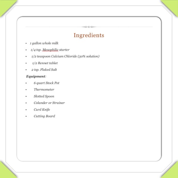 However, I had my package of cheese making gear from Glengarry Cheese Making and just needed to find a recipe. None of my cheese making books had a recipe so it was on to the trusty (not trusted) WWW to find a recipe.
