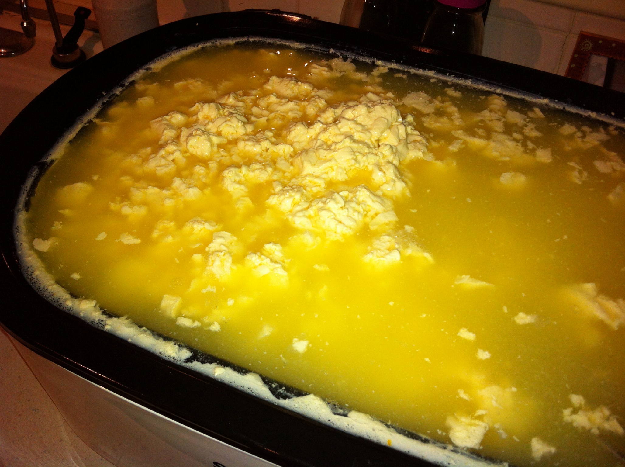 The curds had set nicely and there was a good clean break and the curds had pulled away from the edge of the pot.