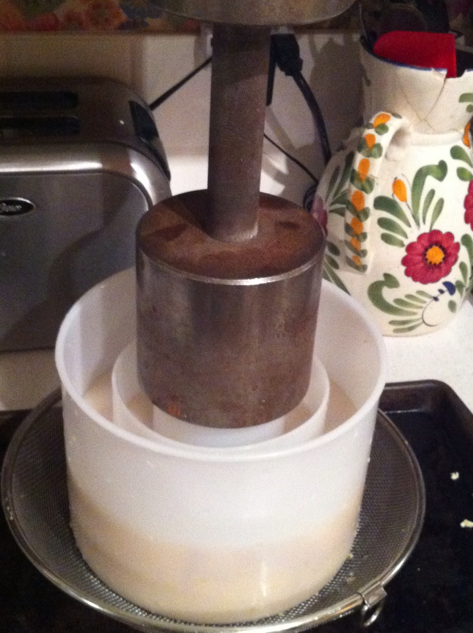 To speed the process I took the last of the curds and placed them in a muslin-lined colander to drain the whey and then added to the molds as room permitted. Eventually all of the curds fit into the four molds.