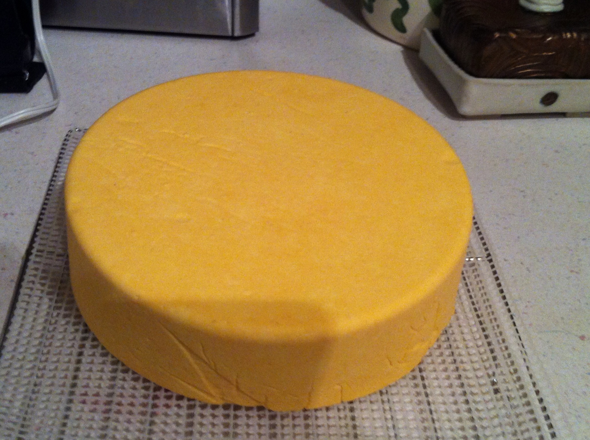 I used a heavy brine, submerging the cheese into the brine and sprinkling the top with salt. I left the cheese in the brine for 9.5 hours. The recipe called for brining 3 to 4 hours per pound. My cheese weighed about 4 pounds so it should have been brined for 12 to 16 hours but we were running late to go to my folks for what was left of Easter Weekend. I dried the cheese and placed it in my “cheese cave” at 10 degC and we hit the road for Camrose.