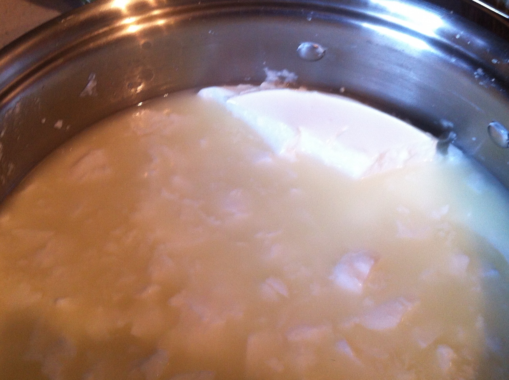 Mix all of your potions and elixirs before beginning. For this recipe I used tablet rennet so I crushed the tablet and dissolved in water before I needed it. I also diluted the calcium chloride before I needed it.