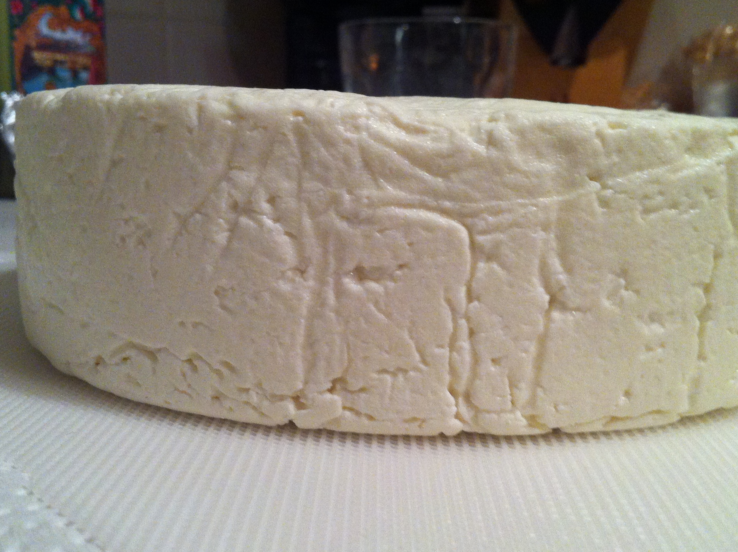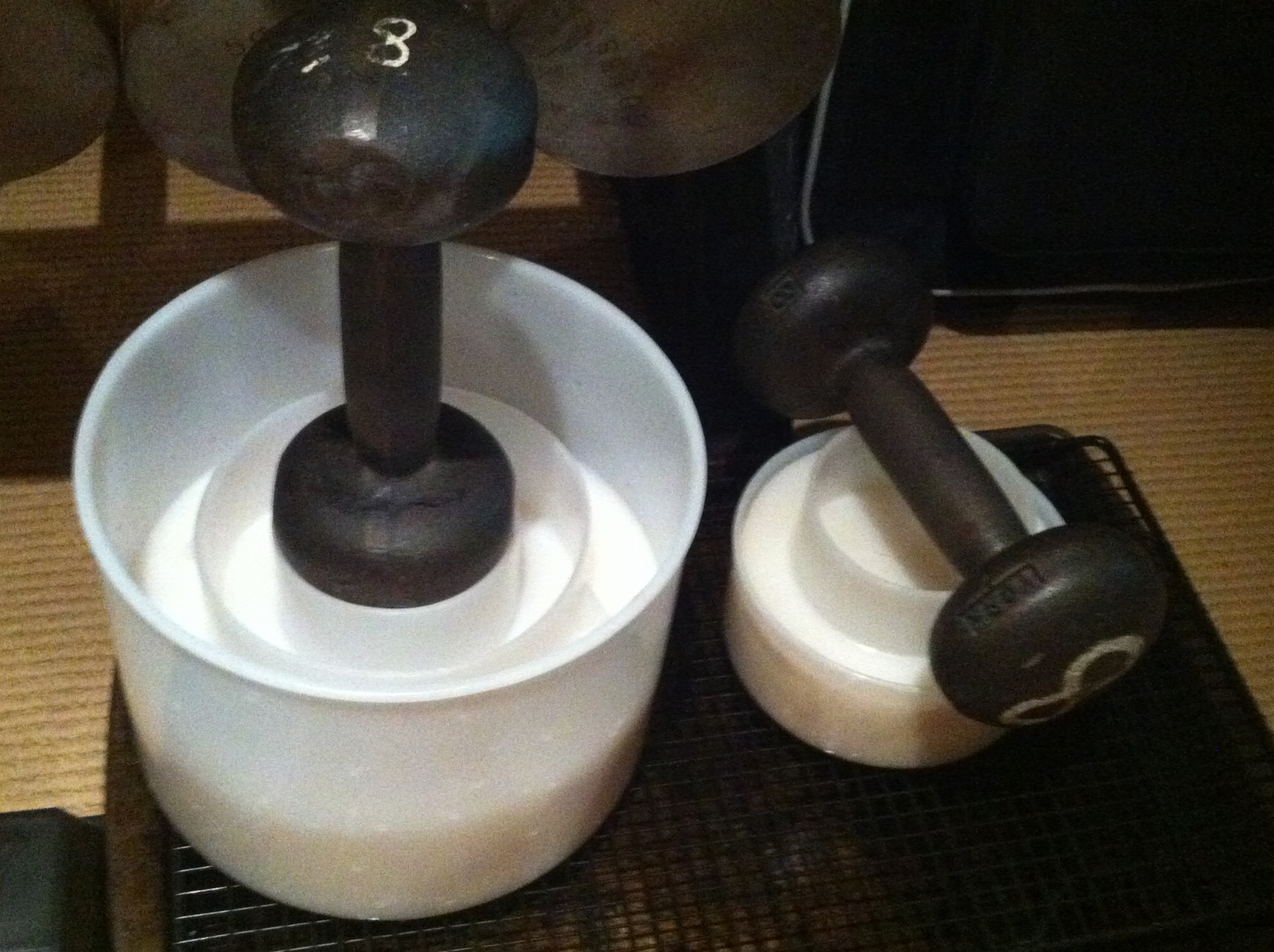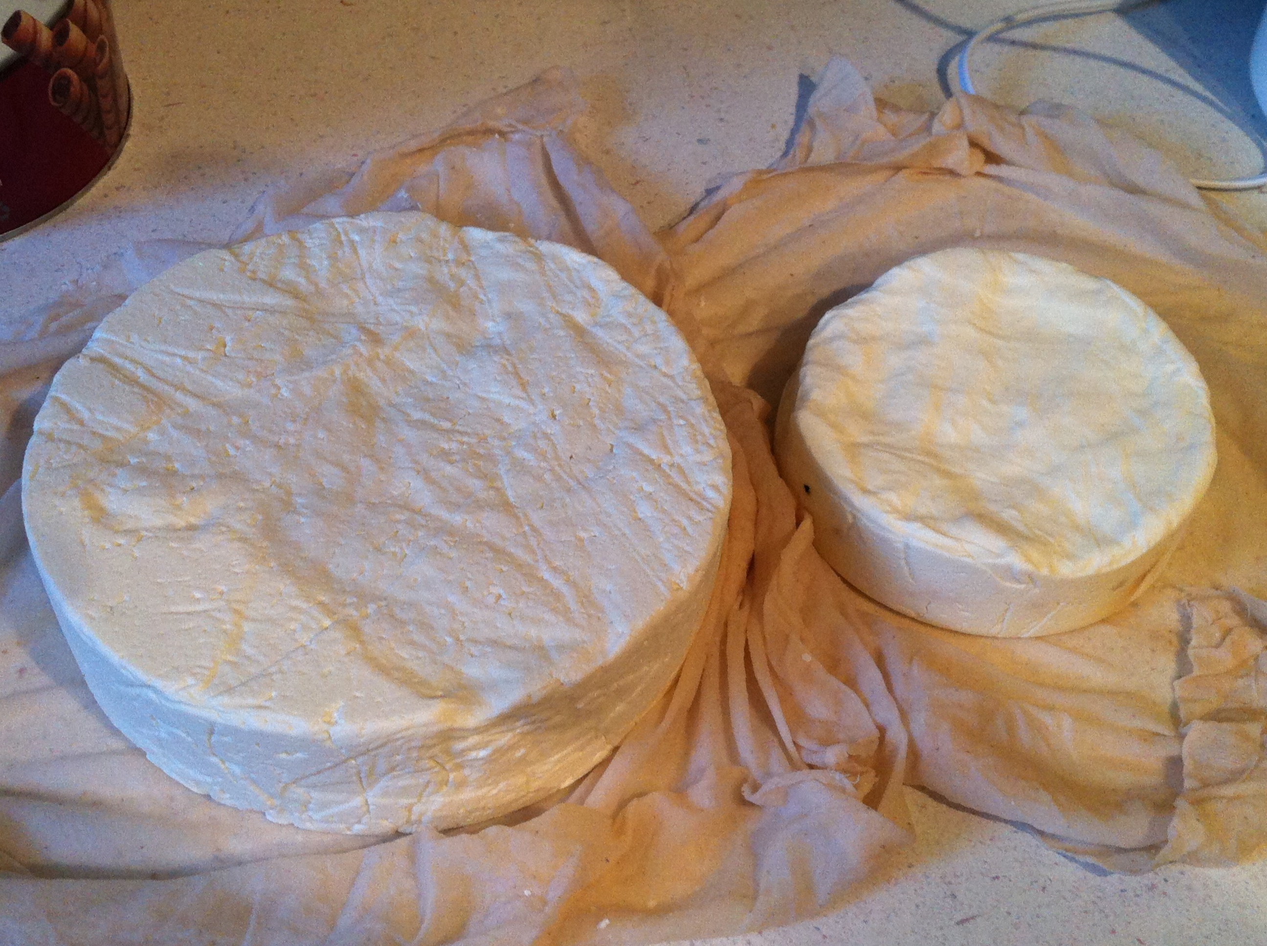 My second concern is that I didn’t press with enough weight. While the cheeses were brining (after pressing was complete) Ian tweeted to the Cheesepalooza group that the press weight is partly determined by the diameter of the cheese hoop (mold). I increased the milk volume and used my big Tome mold with the additional curd but I pressed at the recommended weight and time for the smaller sized mold so I am concerned I may not have expelled all of the whey.