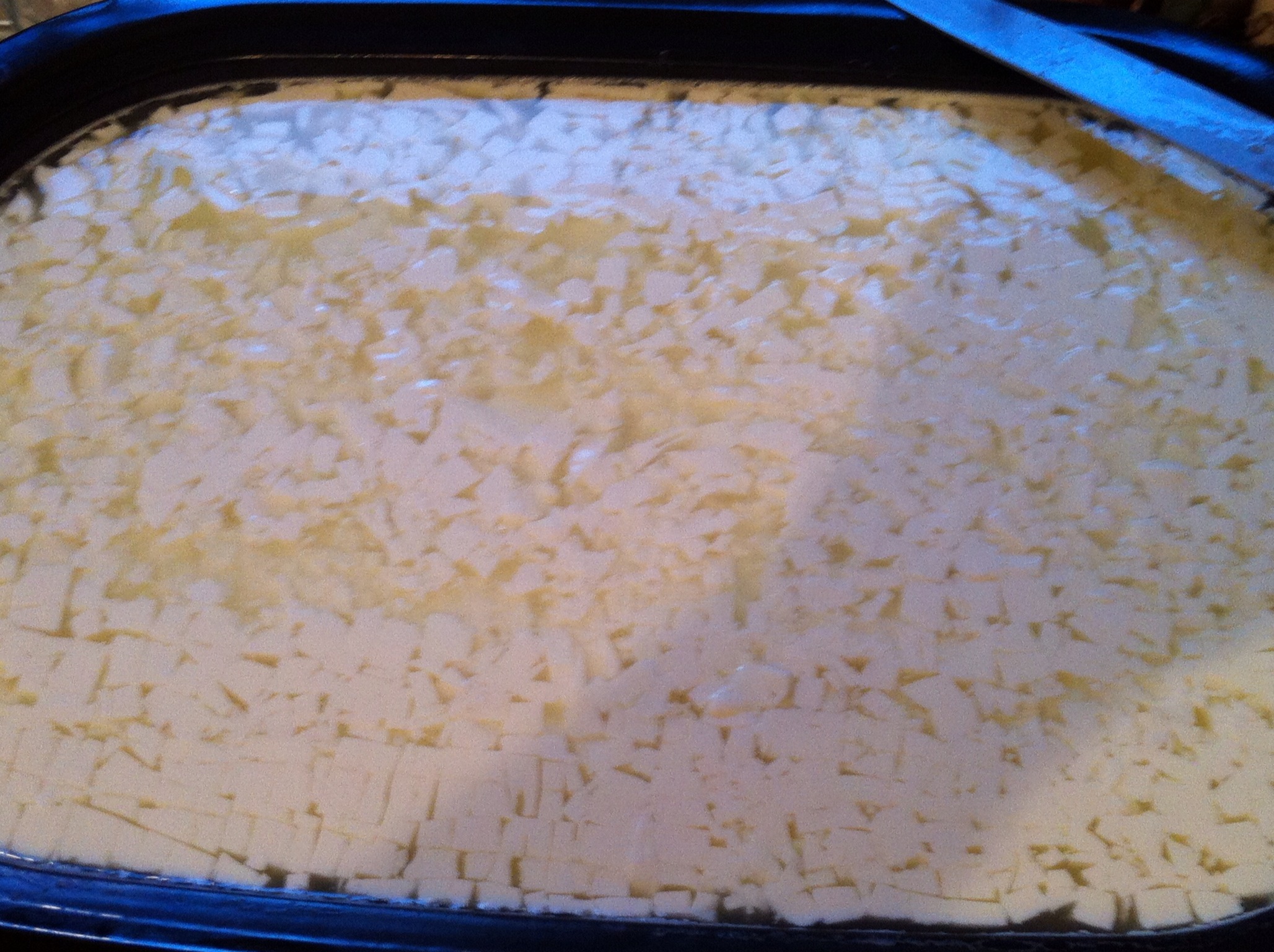 Next cut the curd into 1/4″ cubes and rest for 5 minutes.